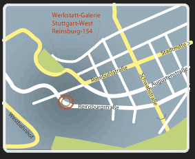 Öffnungszeiten Die Galerie ist geöffnet von Mittwoch bis Freitag 15.00 - 18.00 Uhr Samstag: 11.00 - 13.00 Uhr Sowie nach Vereinbarung: fon (0711) 65 06 34 mail: info@galerie-glueck.de Adresse WERKSTATT-GALERIE Friederike Glück Reinsburgstraße 154 D-70197 Stuttgart fon (0711) 65 06 34 fax (0711) 62 05 523 Anfahrt Sie finden uns im Stuttgarter Westen, im oberen Teil der Reinsburgstraße. Hausnummer 154, um genau zu sein... Sie